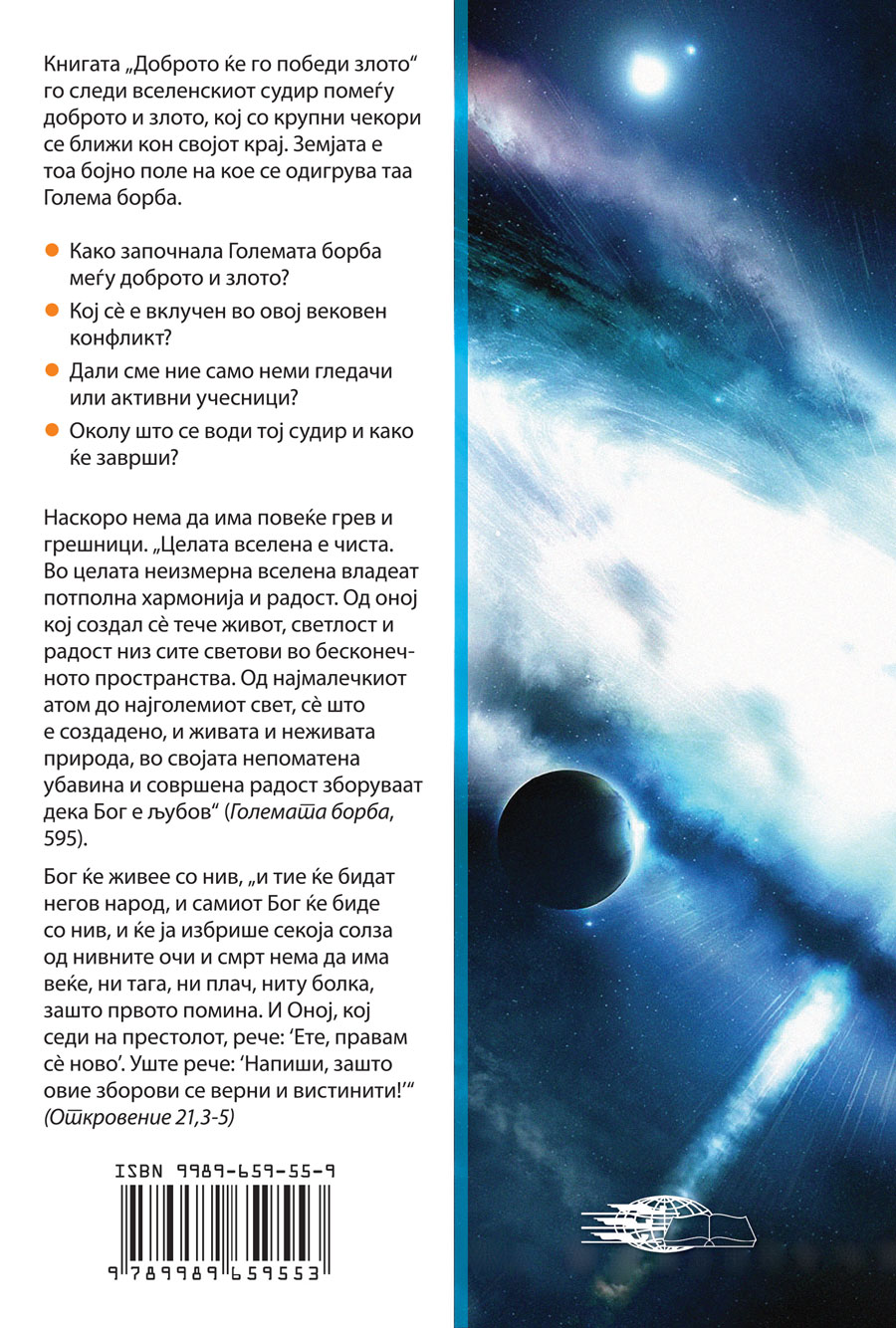 Наскоро нема да има повеќе грев и грешници. „Целата вселена е чиста. Во целата неизмерна вселена владеат потполна хармонија и радост. Од оној кој создал сè тече живот, светлост и радост низ сите светови во бесконечното пространства. Од најмалечкиот атом до најголемиот свет, сè што е создадено, и живата и неживата природа, во својата непоматена убавина и совршена радост зборуваат дека Бог е љубов“ (Големата борба, 595).